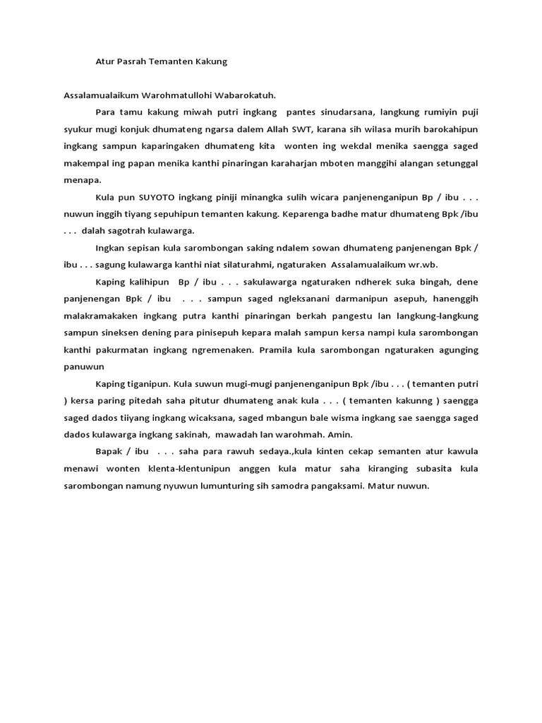 Erniani djihad sismiyati (alm) ingkang tuhu kinurmatan. Yang menerima calon mempelai pria adalah pihak keluarga wanita. Bagi sebagian kalangan, membuat naskah ceramah bahasa jawa itu ibarat membalikan telapak tangan. Tuladha atur pasrah temanten kakung 2. Acara pasrah tinampi pengantin jawa (foto : Nuwun para pinisepuh ingkang satuhu kinabekten. Panjenenganipun ingkang dhahat kinabekten, para pepundhen, para pinisepuh, saha para sesepuh ingkang tansah anggung mestuti dhumateng darmaning kautamen. Pidato bahasa jawa atur pasrah temanten kakung ini disampaikan oleh pihak besan lelaki. Tukang pasrah tersebut, bisa dari orangtua kandung temanten, atau bisa juga diwakilkan. Contoh teks panampi pasrah pengantin jawa terbaru. Diantaranya sebelum kedua mempelai bertemu dan melaksanakan acara yag dinamakan adicara panggih, terdapat acara yang dinamakan pasrah lan panampi atau lung tinampen atau dalam bahasa indonesia bisa di artikan serah terima. Dalam acara resepsi pernikahan adat jawa terdapat barbagai rangakaian susunan acaranya. Tapi bagi pemula seperti penulis ini bisa pusing tujuh keliling apalagi yang memakai bahasa jawa.