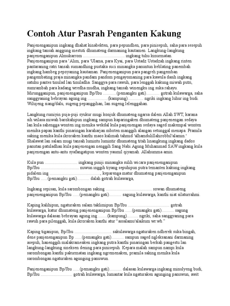 Dalam upacara pengantin adat jawa tengah, pasrah temanten kakung biasanya mendapat urutan acara yang pertama setelah pembawa acara atau panoto acoro membuka acara tersebut. Pidato penyerahan pengantin memakai bahasa jawa. Poro rawuh sekaliyan ingkang winantu pakurmatan, langkung langkung dateng priyagung lan poro sepuh ingkang mahambeg dharmo, pono ing pamawas, miwah lebdo ing pitutur, prasasat linobong ing manah ingkang dahat suto amorwoto suko, dupi anggenipun anguningani yen ta sajroning sasana pawiwahan, kawuryan. Tukang pasrah tersebut, bisa dari orangtua kandung temanten, atau bisa juga diwakilkan. Atur panampi pasrah calon pinanganten kakung. Pidato bahasa jawa pasrah penganten pidato serah terima pengantin dalam bahasa jawa atur pasrah temanten singkat teks pidato pasrah temanten kakung download pidato penyerahan pengantin pria bahasa jawa atur panampi pasrah. Pidato bahasa jawa atur pasrah temanten kakung ini disampaikan oleh pihak besan lelaki. Nyuwun sewu awit kalepatan kula, dene anggen kula cumanthaka marak mangarsa hangempil. Nuwun, dumateng para pepundhen ingkang satuhu kinabekten, para pinisepuh miwah sesepuh ingkang kinurmatan, ugi para tamu ingkang minulya, sarta kadang kula wredha miwah mudha ingkang sutresna. Acara pasrah tinampi pengantin jawa (foto : Bagi sebagian kalangan, membuat naskah ceramah bahasa jawa itu ibarat membalikan telapak tangan. Dalam acara resepsi pernikahan adat jawa terdapat barbagai rangakaian susunan acaranya. Nuwun, katentreman miwah karahayon, inggih awit sihing gusti ingkang murbeng dumadi mugi tansah hamayungana wonten ing madyaning pawiwahan ing siyang/dalu menika.